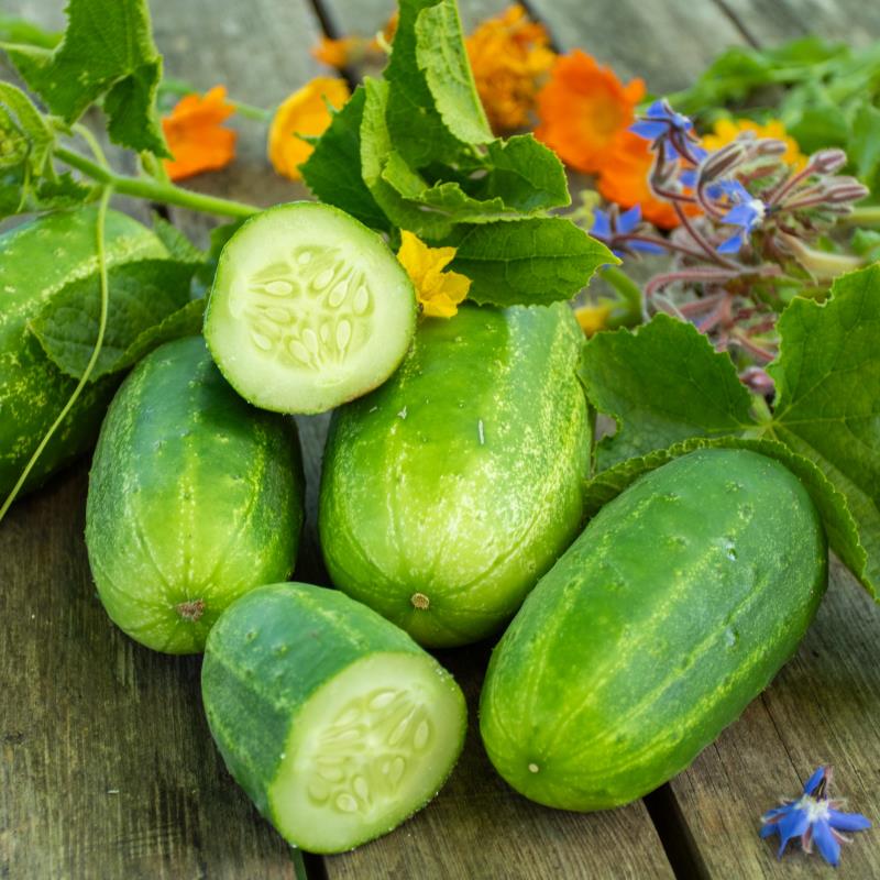 Salat- und Einlegegurke, wird bis zu 17 cm lang, hellgrüne Schale mit weißen Streifen, beständig gegen Mehltauerkrankungen.