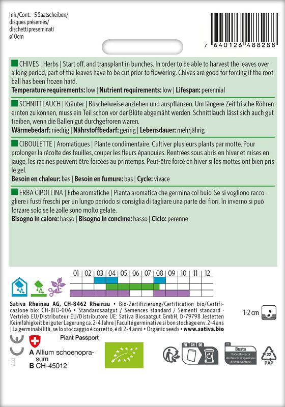 Diese Saatscheiben enthalten Bio-Schnittlauchsaatgut der Sorte ‚Polyvert‘, einer mehrjährigen, robust wachsenden Schnittlauchsorte mit dunkelgrünen, dickwandigen Röhren und aufrechtem, gleichmäßigem Wuchs. Die Sorte liefert hohe Erträge, treibt nach dem Schnitt zuverlässig wieder aus und bleibt lange homogen. Die Pflanzen werden etwa zwanzig bis vierzig Zentimeter hoch und eignen sich hervorragend zum Frischverzehr, Einfrieren oder Trocknen.