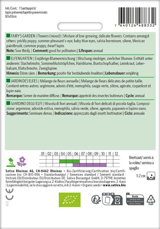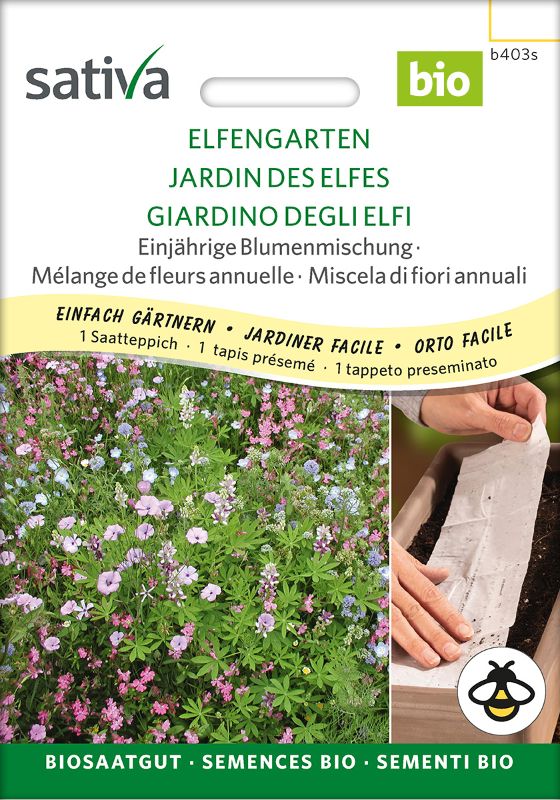 Der Saatteppich macht die Aussaat besonders einfach: Die Samen sind bereits optimal verteilt und in einem biologisch abbaubaren Vlies fixiert. Nach dem Auslegen und leichten Bedecken mit Erde entwickelt sich der 'Elfengarten' fast wie von selbst – ganz ohne aufwendiges Pikieren oder Vereinzeln. Die Mischung eignet sich hervorragend für sonnige Lagen, ob im Beet, in größeren Pflanzgefäßen oder entlang von Wegen. Neben ihrer optischen Wirkung locken die Blüten auch zahlreiche bestäubende Insekten an und fördern so die Artenvielfalt im Garten.