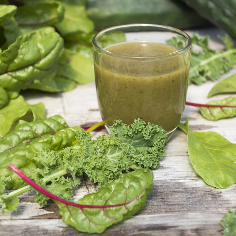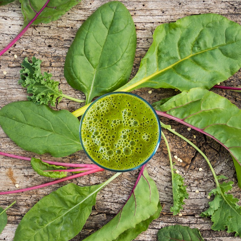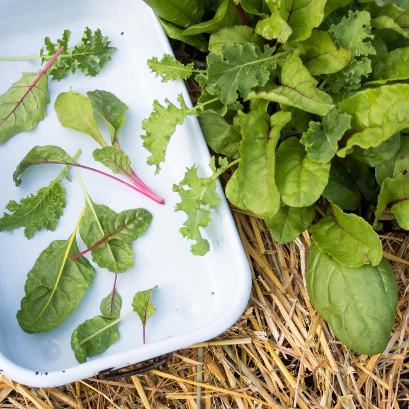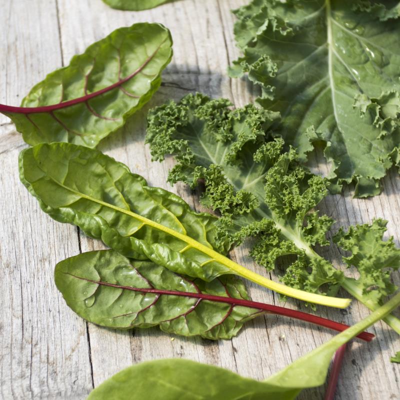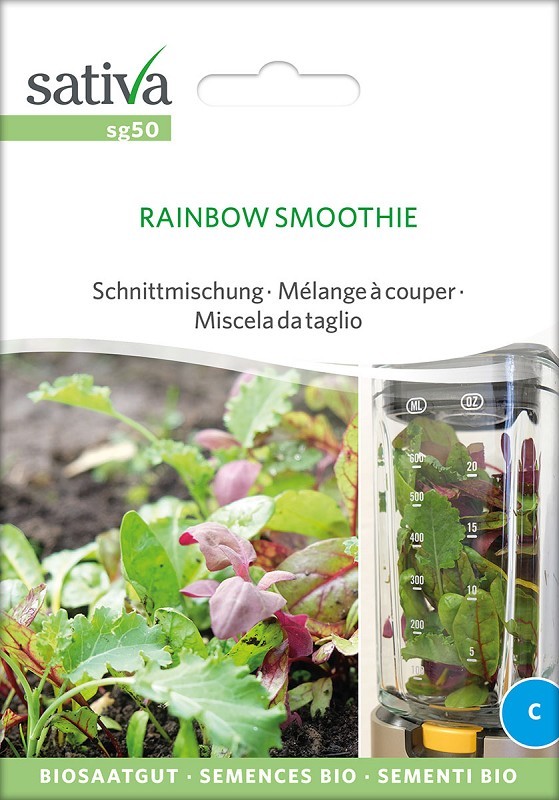 Farbige Blattmischung zur Verwendung im Smoothie-Mixer: Grüner Grünkohl, rotlaubige Rande, grüner Spinat, rote Gartenmelde, bunter Mangold. Die Blätter können kontinuierlich geerntet werden. Im Smoothie gut mit z.B. Apfel, Birne, Kiwi oder Banane.