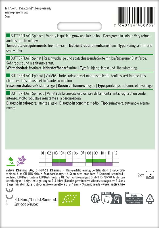 Das Saatband Spinat 'Butterflay' macht den Anbau von frischem Blattgemüse besonders einfach und effizient – ideal für Garten, Hochbeet oder Balkon. Die Sorte überzeugt durch rasches Wachstum, eine kräftig grüne Blattfarbe und ihre Widerstandskraft gegen Echten Mehltau. Zudem ist sie ausgesprochen robust und frosthart, wodurch sie sich sowohl für die Frühjahrsaussaat als auch für Herbstkultur und Überwinterung bestens eignet.
