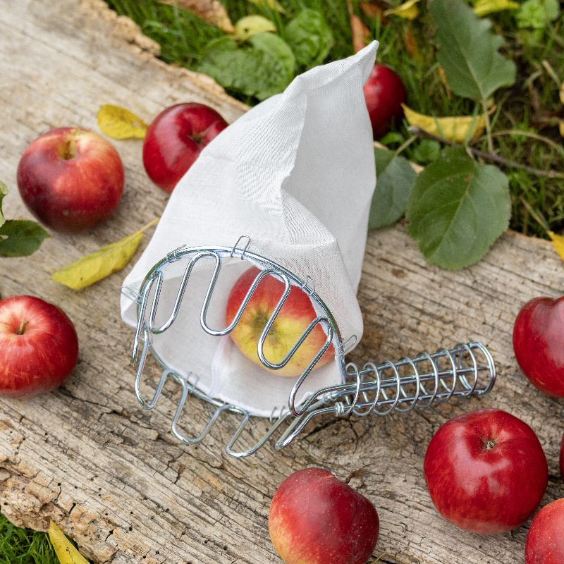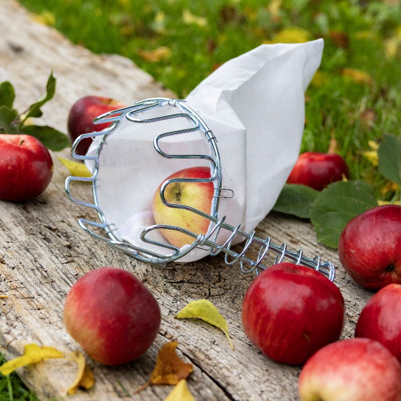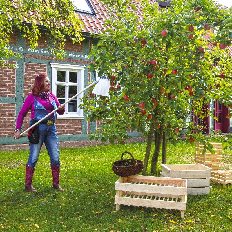 Mit dem Obstpflücker können Sie Äpfel und anderes Obst schonend und ohne Druckstellen von hohen Bäumen ernten. Mit dem Obstpflücker geerntete Äpfel, z.B. Boskoop sind, wenn sie direkt in gepolsterte Kisten gelegt werden, monatelang lagerfähig und stellen einen echten Wintervorrat dar.