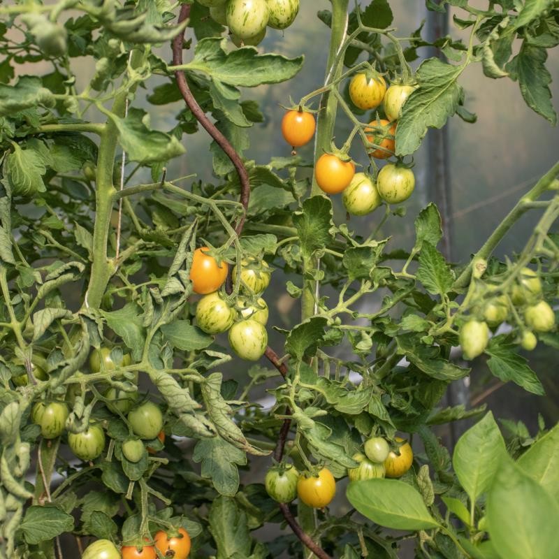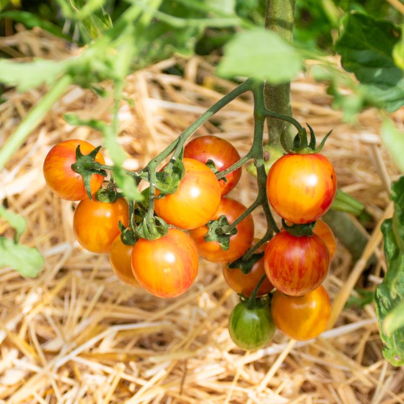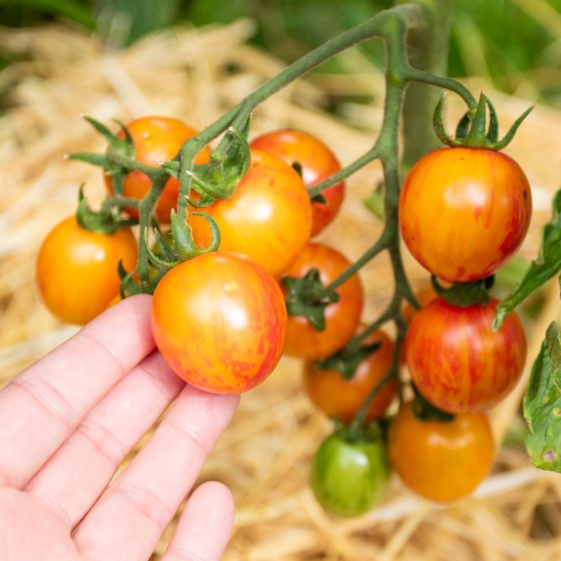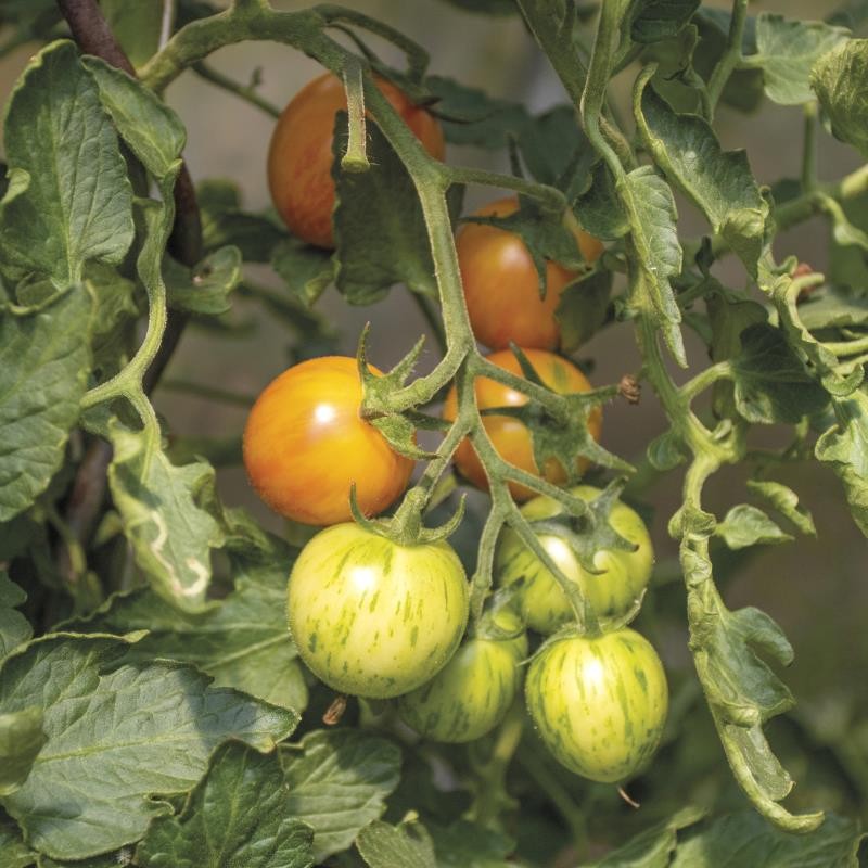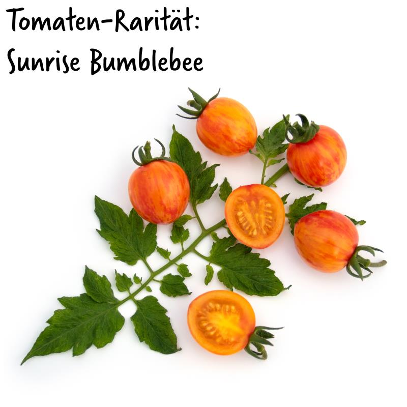 Sunrise Bumblebee ist für manche eine der schönsten Kirschtomaten, ein Muss für alle Jäger und Sammler der interessanten Tomatenraritäten. Dazu ist sie sehr süß und lecker. Die Früchte reifen orange mit roten Streifen ab und wiegen etwa 20 g. Sie sind besonders dekorativ auf Salat- und Rohkostplatten. Tolerant gegen Braunfäule und Blütenendfäule.