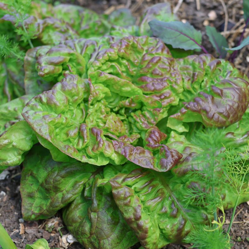 Bataviasalat ‘Mariniski’ bildet lockere, halboffene Köpfe mit grün-roten Blättern. ‘Mariniski’ ist robust, standfest und wenig anfällig für Schossen oder Innenbrand.