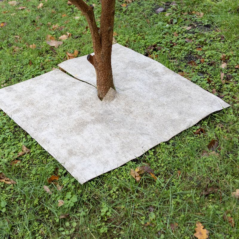 Eine unkrautfreie Baumscheibe erleichtert jungen Gehölzen das Anwachsen und ein guter Start in ihre ersten Jahre. Die Abdeckung verhindert das Wachstum von Gräsern und Kräutern. Die Erde bleibt darunter weich, das Bodenleben wird geschützt und weniger Wasser verdunstet. Die Baumscheibenabdeckung aus Hanf ist ein Naturprodukt und nach mehreren Jahren vollständig kompostierbar, so dass sie keinen Müll in der Welt hinterlässt.